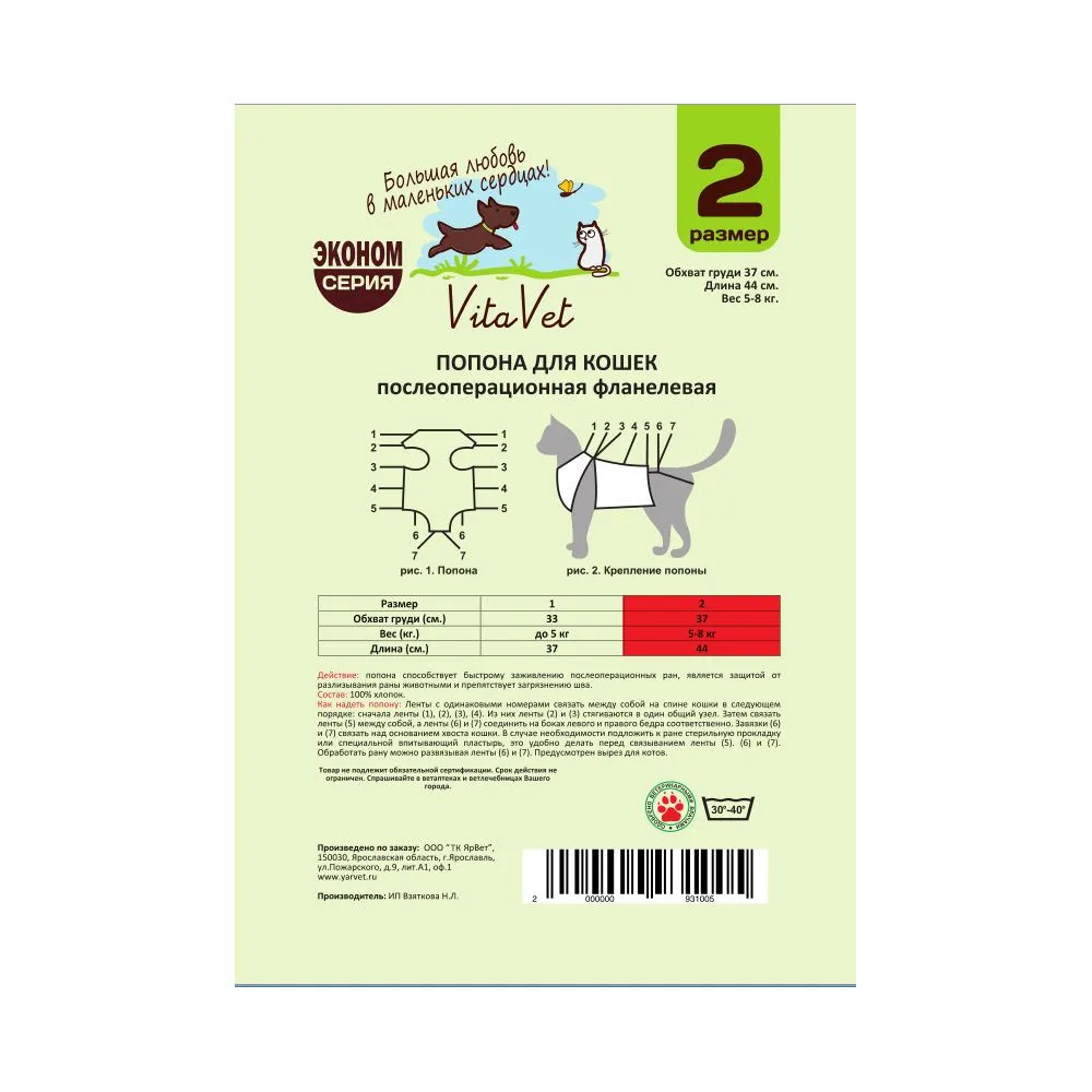 Попона "VitaVet PRO" послеоперационная для кошек двухслойная №2 большая